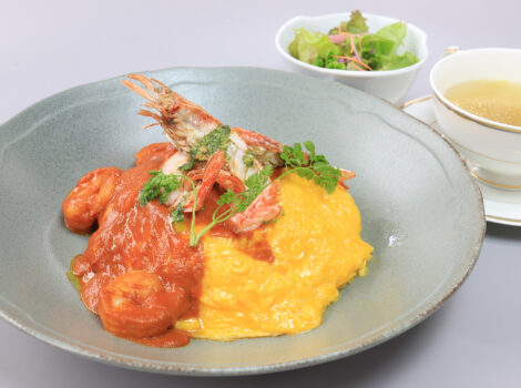 ふわっふわの卵に包まれたライスに濃厚なトマトクリームソースと香ばしい海老を合わせました。