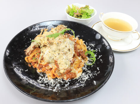 幅広でもっちりとしたフィットチーネにボロネーゼソースと香り豊かなポルチーニ茸を使用した秋らしいパスタです。