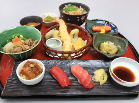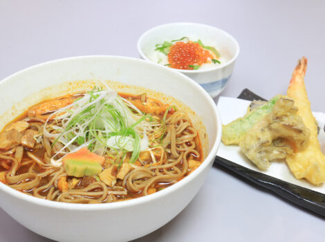 和の出汁香るカレー南蛮そばに、揚げたての天婦羅と贅沢ないくら御飯を添えました。