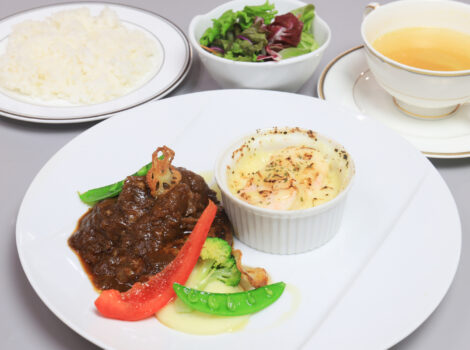 柔らかく煮込んだ牛タンシチューとハンバーグを合わせました。